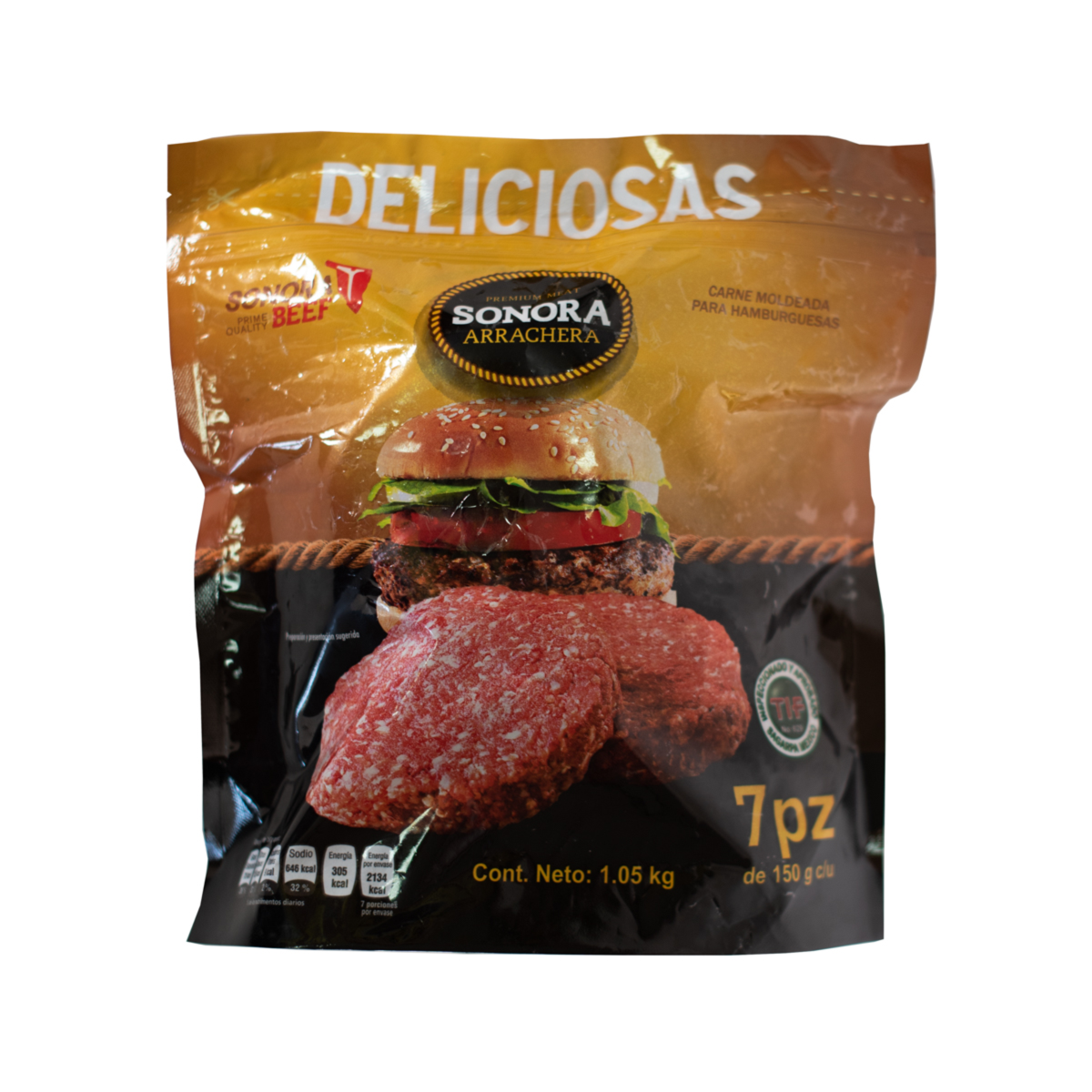 La Hamburguesa de Arrachera se presenta en un empaque que contiene 7 piezas con un peso total de 1.05 kg. Esta hamburguesa se elabora con carne de arrachera de res de alta calidad, lo que le brinda un sabor característico y jugosidad a cada bocado.